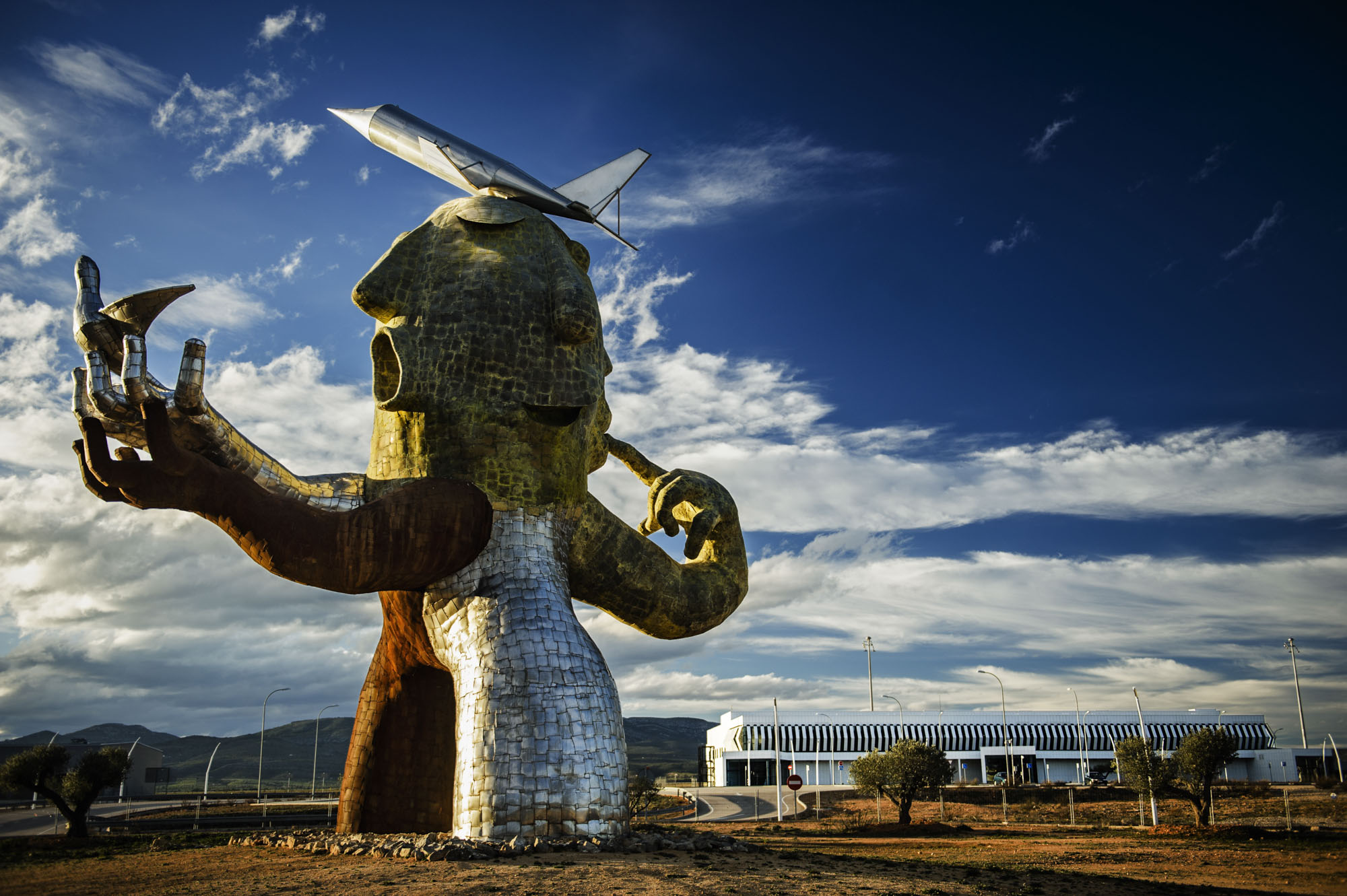 Although it did not have the permits to operate, the airport was officially inaugurated just before local and regional elections in 2011. However, the airport remained closed for almost four years before, in the wake of new elections, it finally opened for traffic. After a few months of receiving sporadic private flights, the first regular connections are scheduled for late 2015. The regional government granted €25 million to the company that took the 20-year concession of the airport, amount that should be added to the almost €170 million of public money spent on its construction, equipment, and various sponsorship deals over the years. The €300,000 sculpture depicts Carlos Fabra, longtime head of the provincial government and driving force behind the airport. For a long time it was the only plane in the airport.